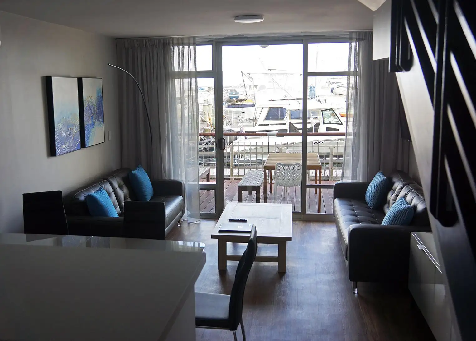 The balcony which adjoins the living area is furnished with an outdoor setting.