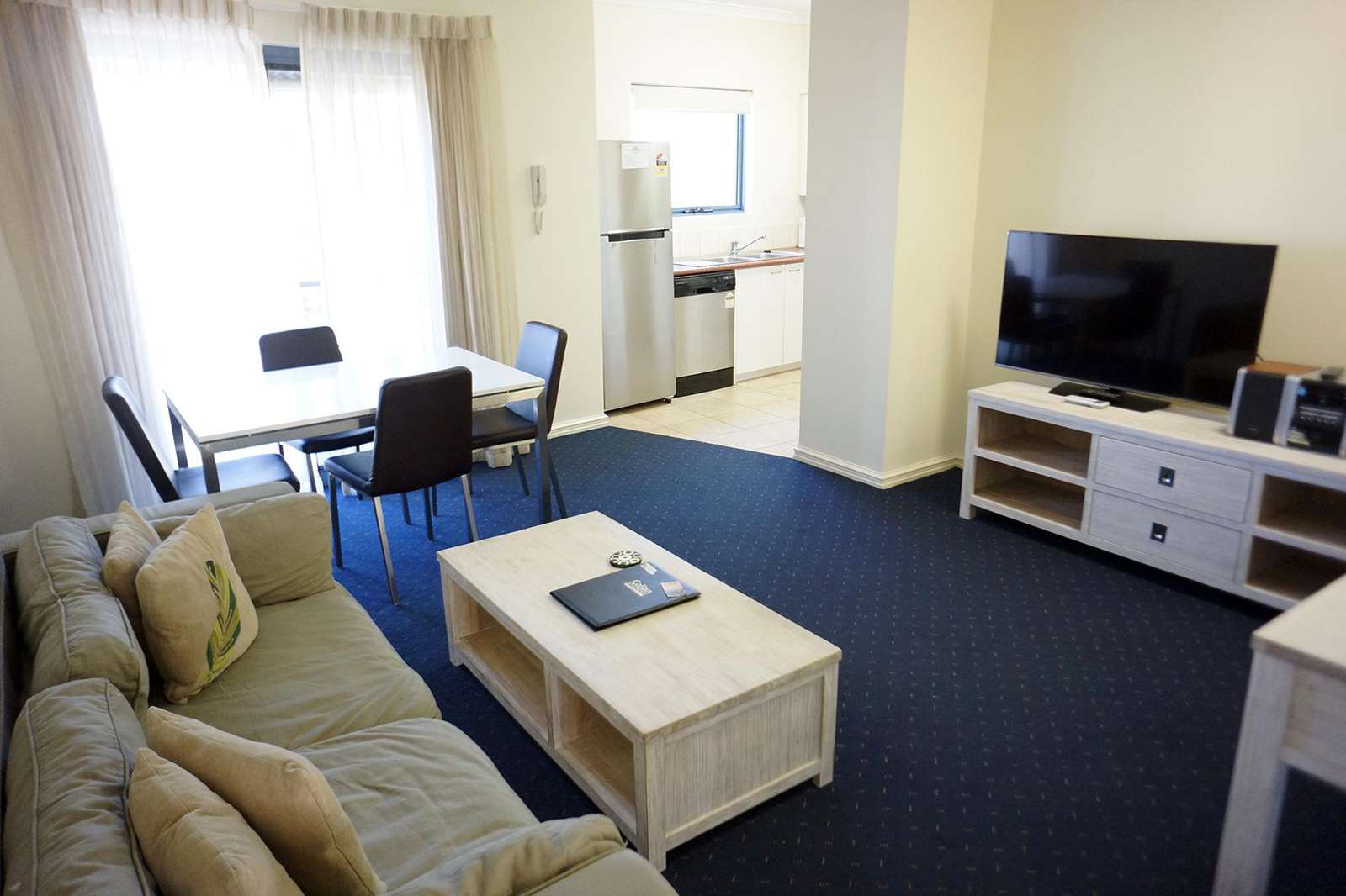 Each apartment has a large living space with a comfortable lounge suite, desk, dining table with 4 chairs and coffee table. Each has a TV, DVD and music centre.