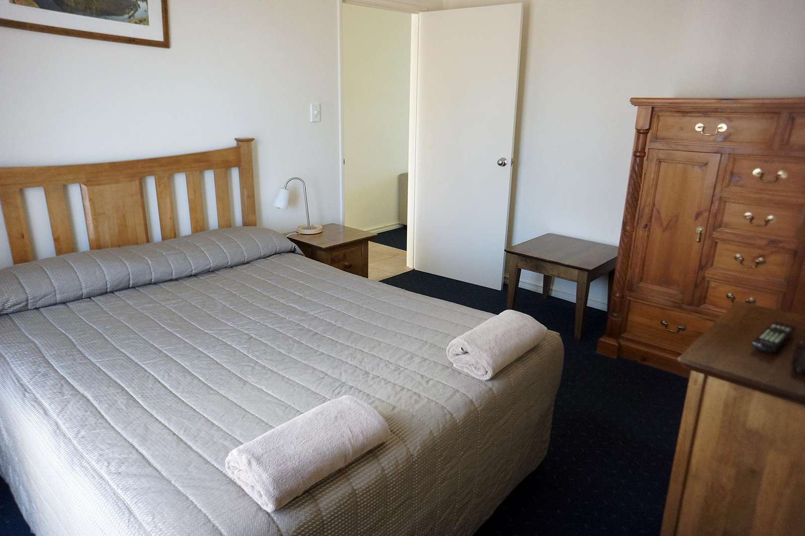 Bedroom is furnished with queen bed, wardrobe and chest of drawers.