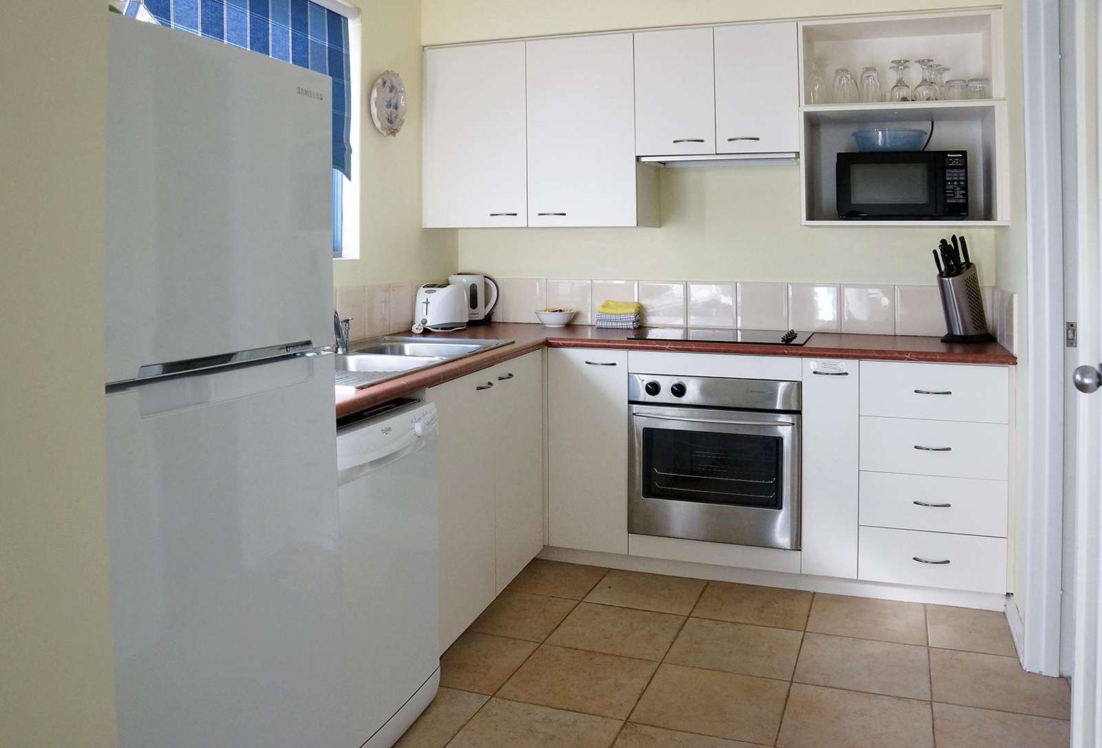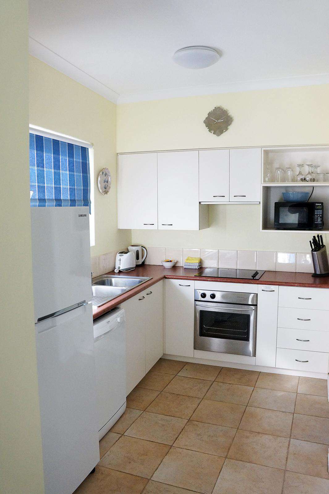 The kitchen is equipped with everything you would need. It has a full oven and separate cook top, a generous fridge/freezer, a microwave completed with lots of cupboard space and every amenity you would need.