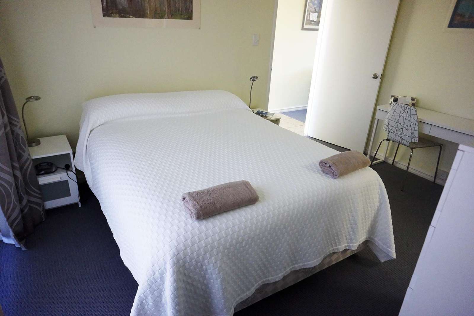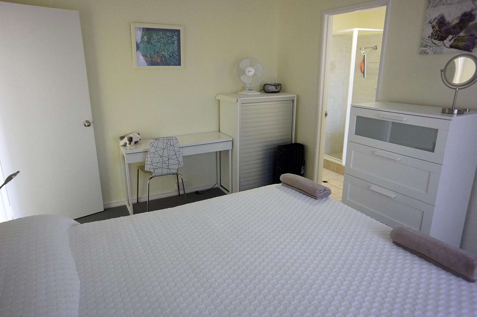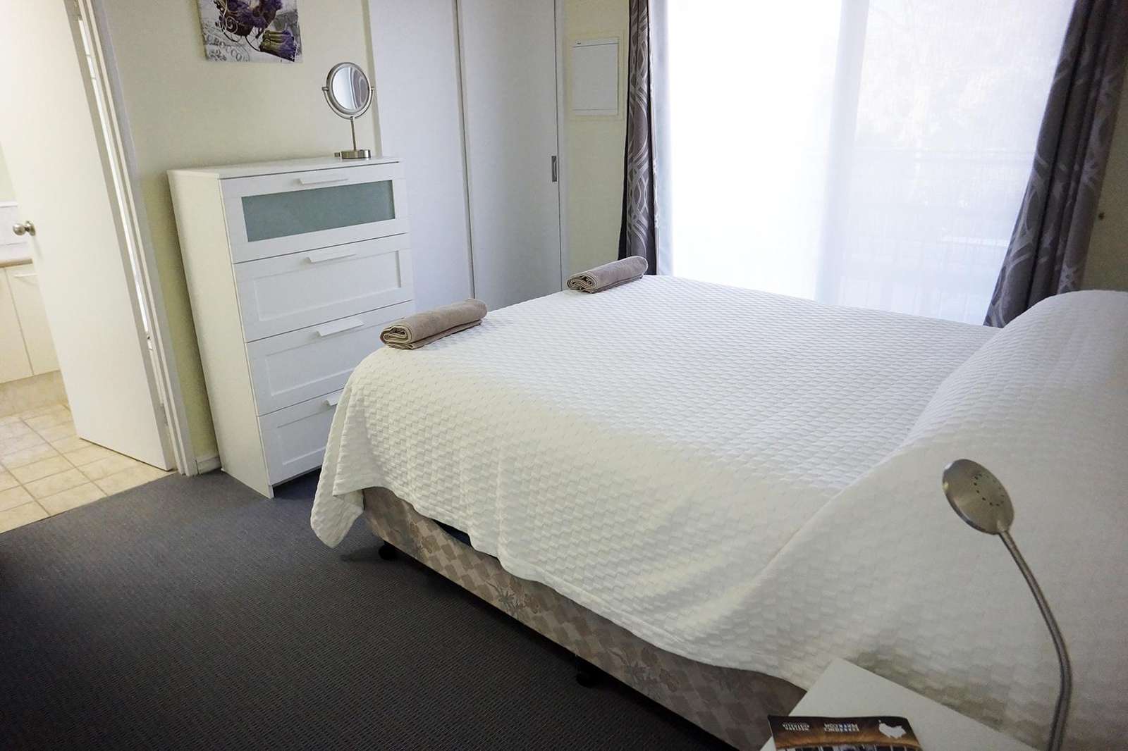 Bedroom is furnished with queen bed, wardrobe and chest of drawers.