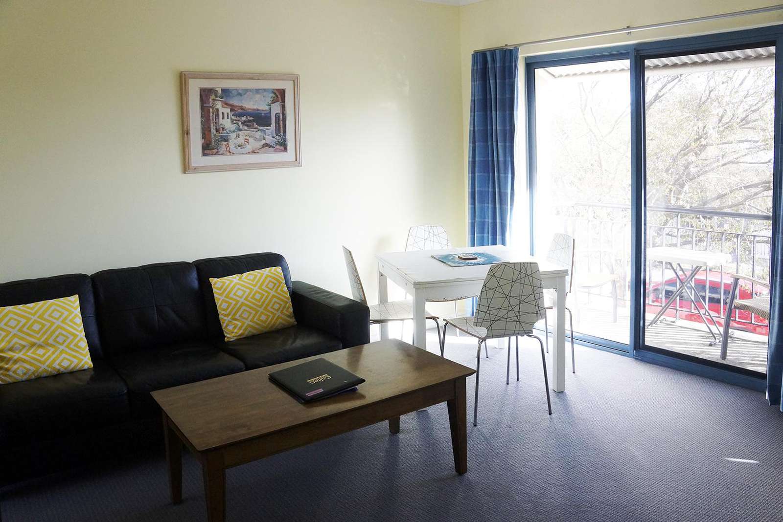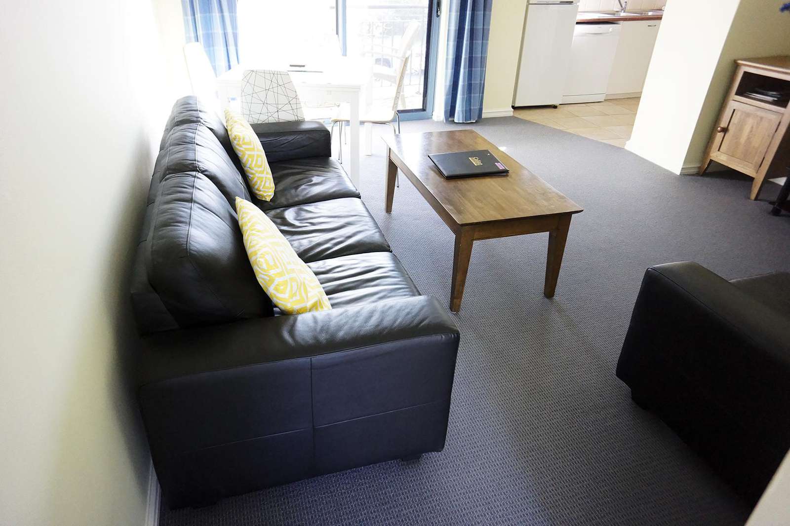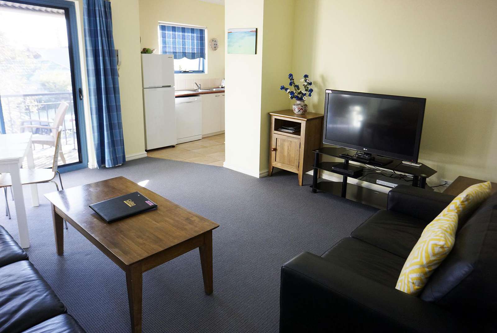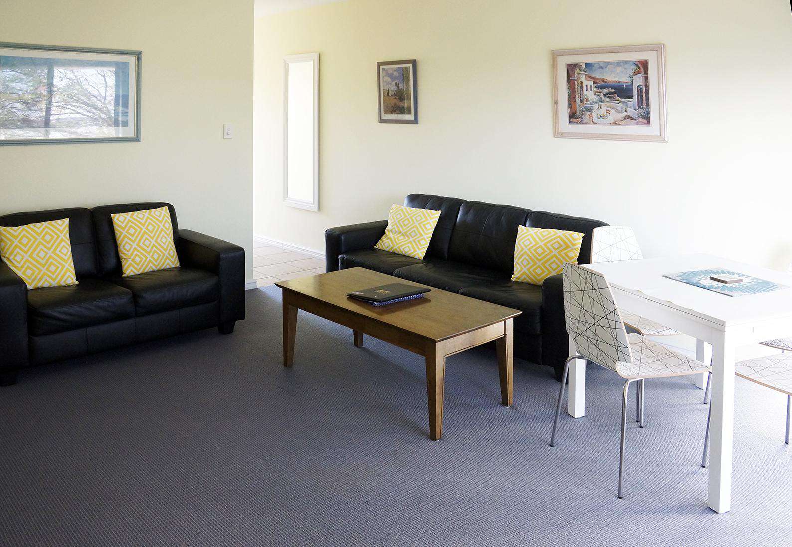 Each apartment has a large living space with a comfortable lounge suite, desk, dining table with 4 chairs and coffee table. Each has a TV, DVD and music centre.