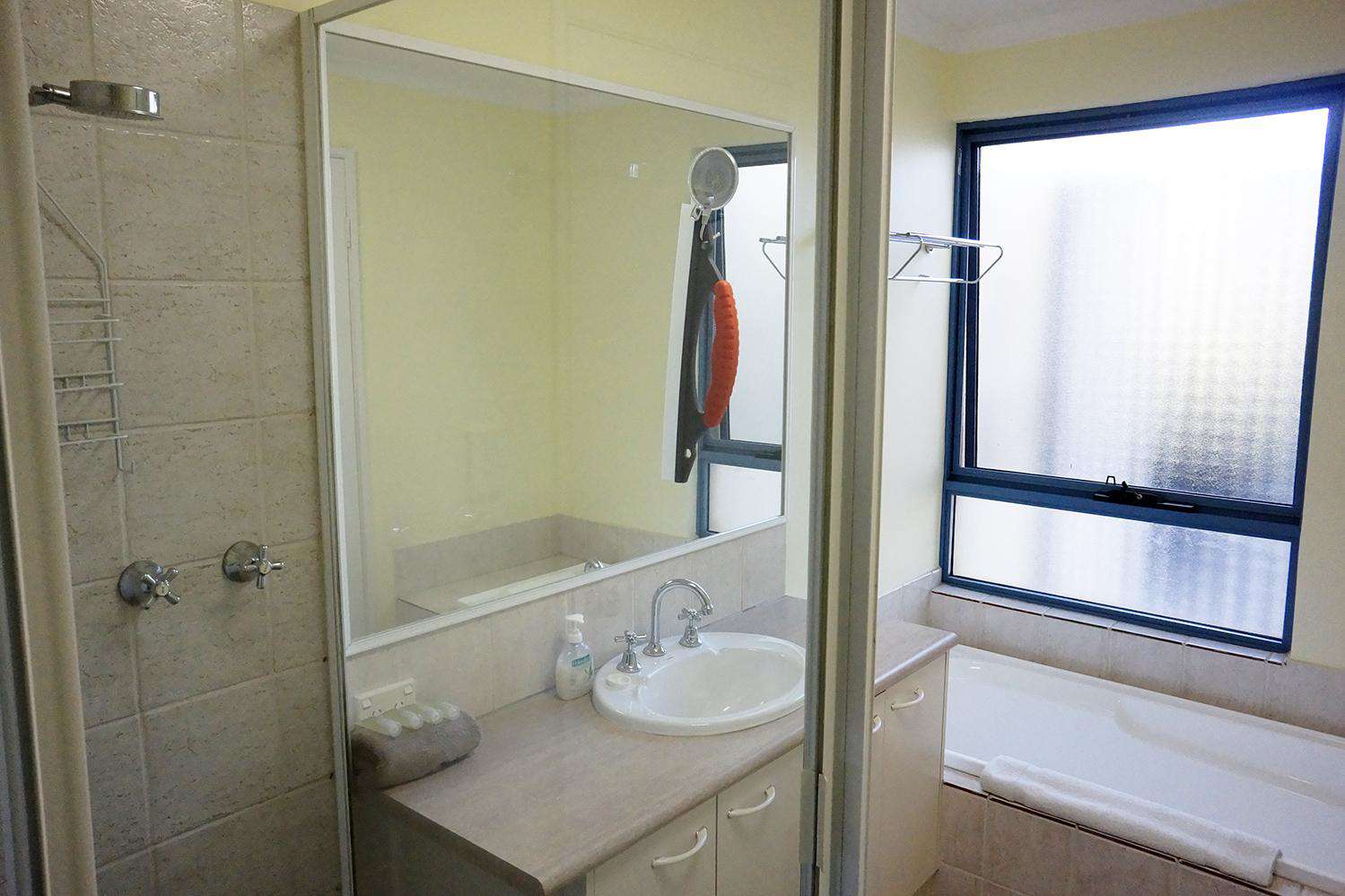 Adjoining bathroom with bath, shower and handbasin. 55 and 49 do not have a bath.