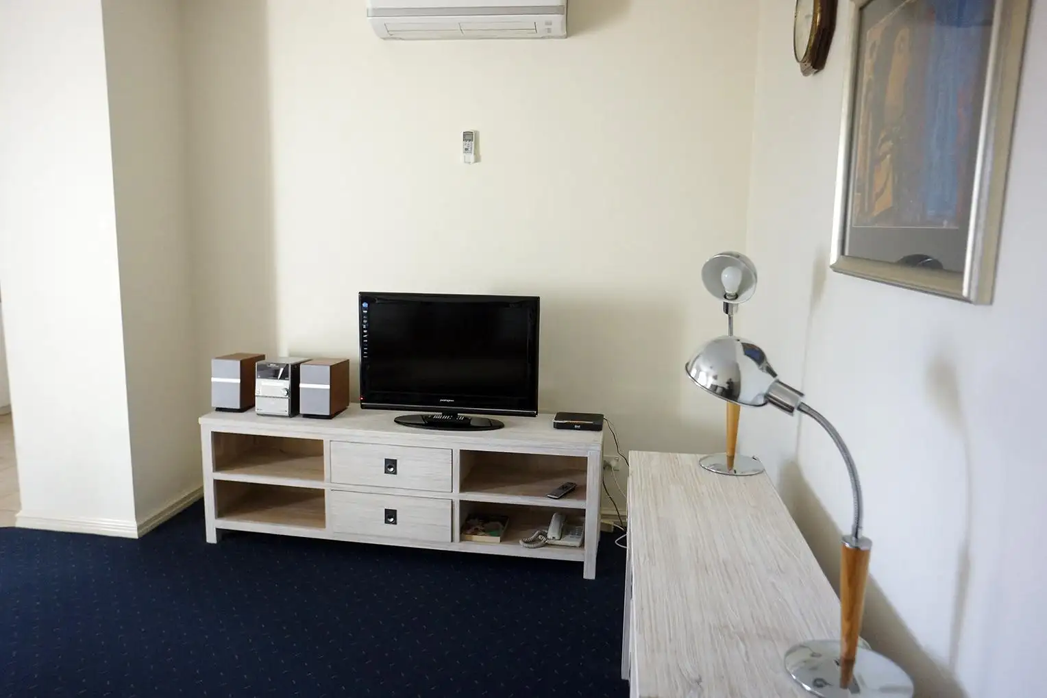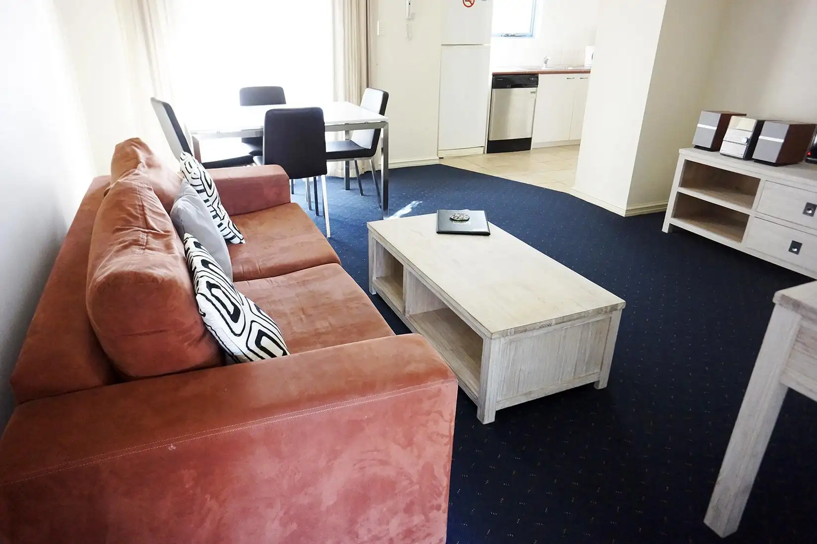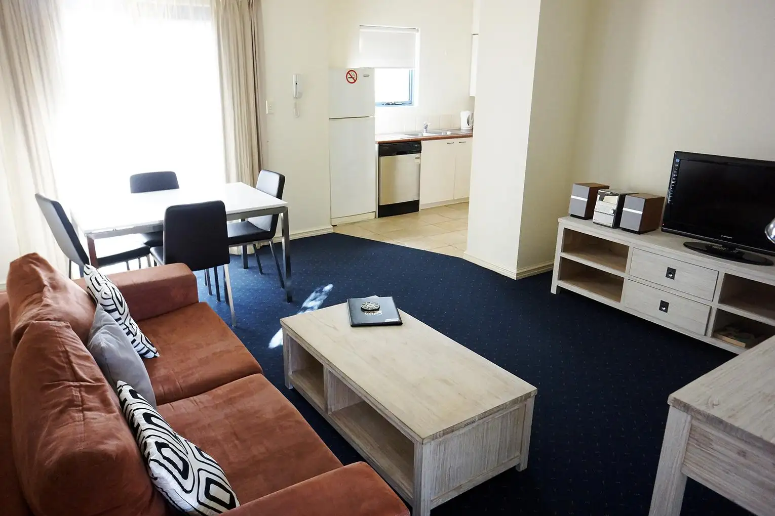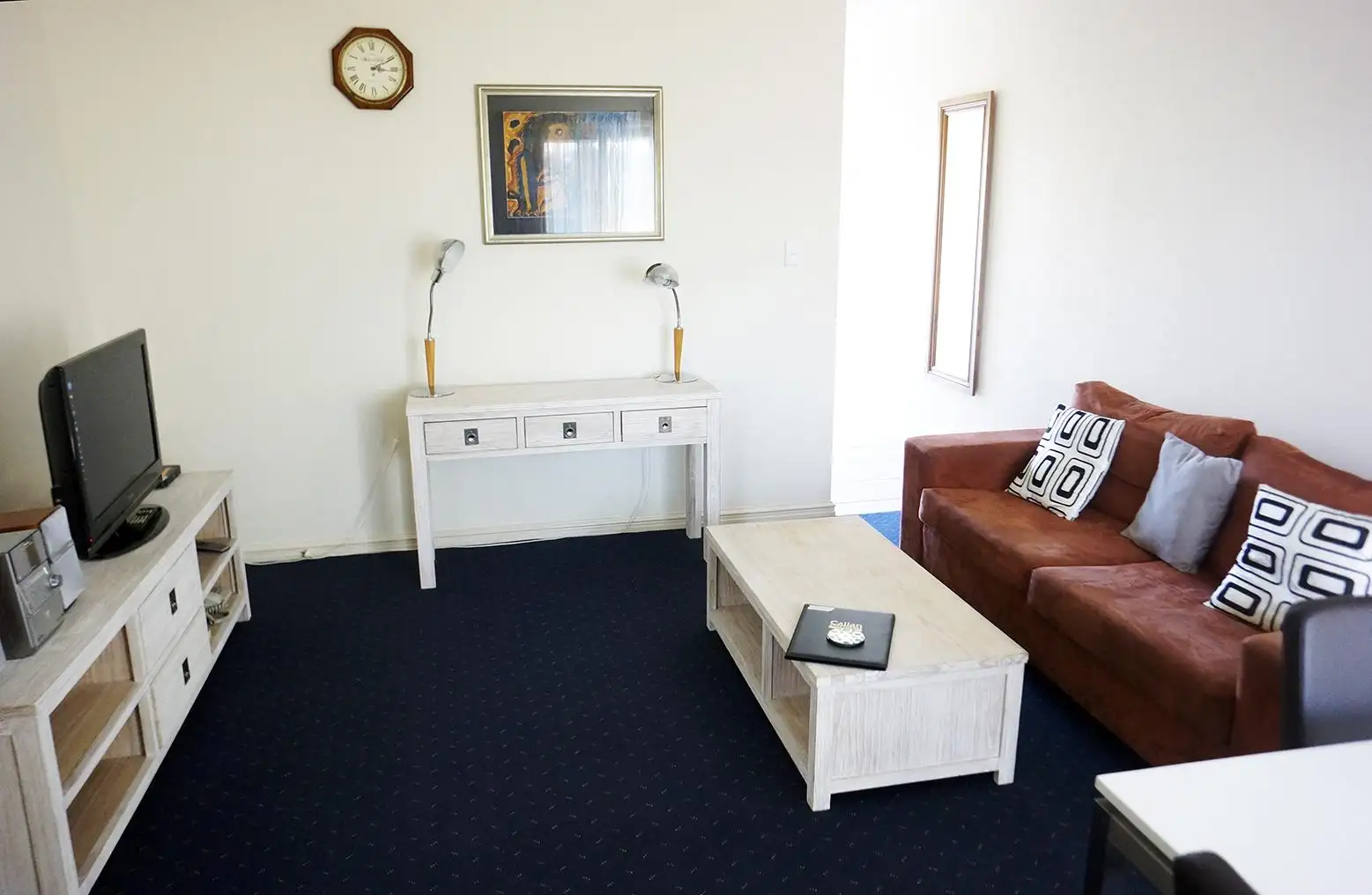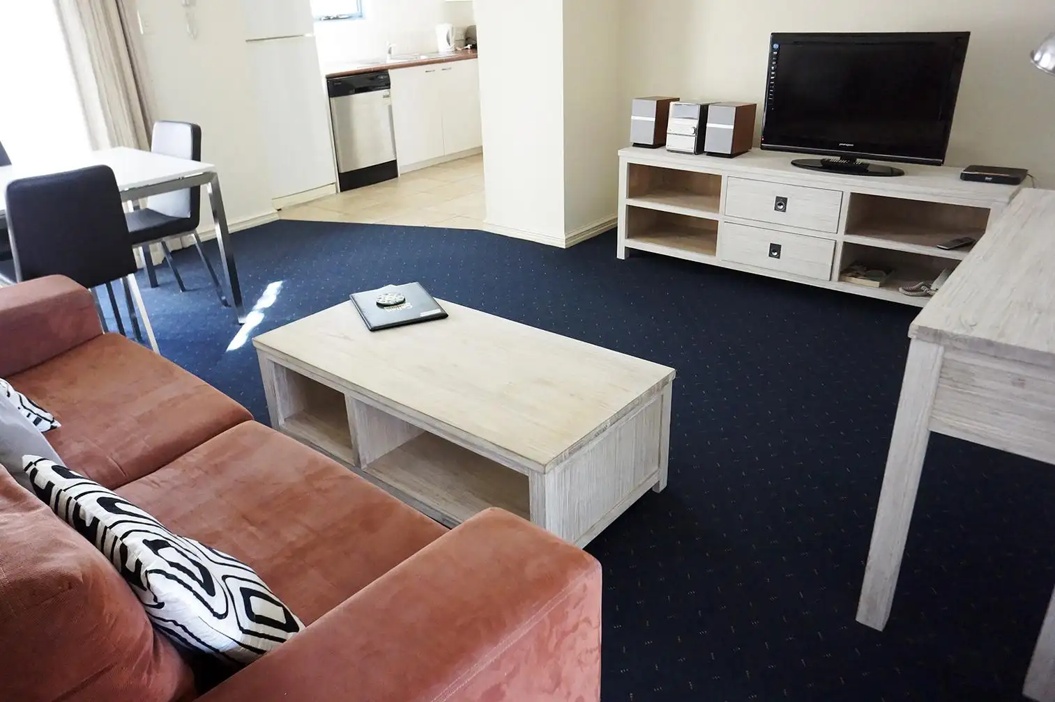 Each apartment has a large living space with a comfortable lounge suite, desk, dining table with 4 chairs and coffee table. Each has a TV, DVD and music centre.