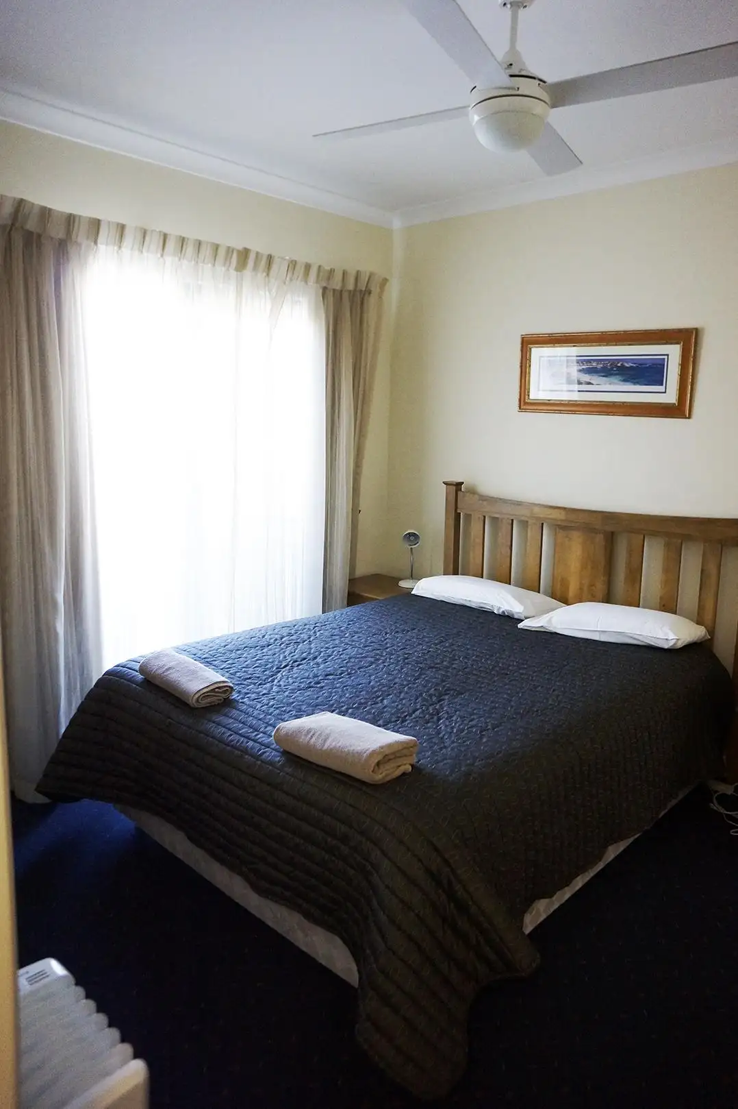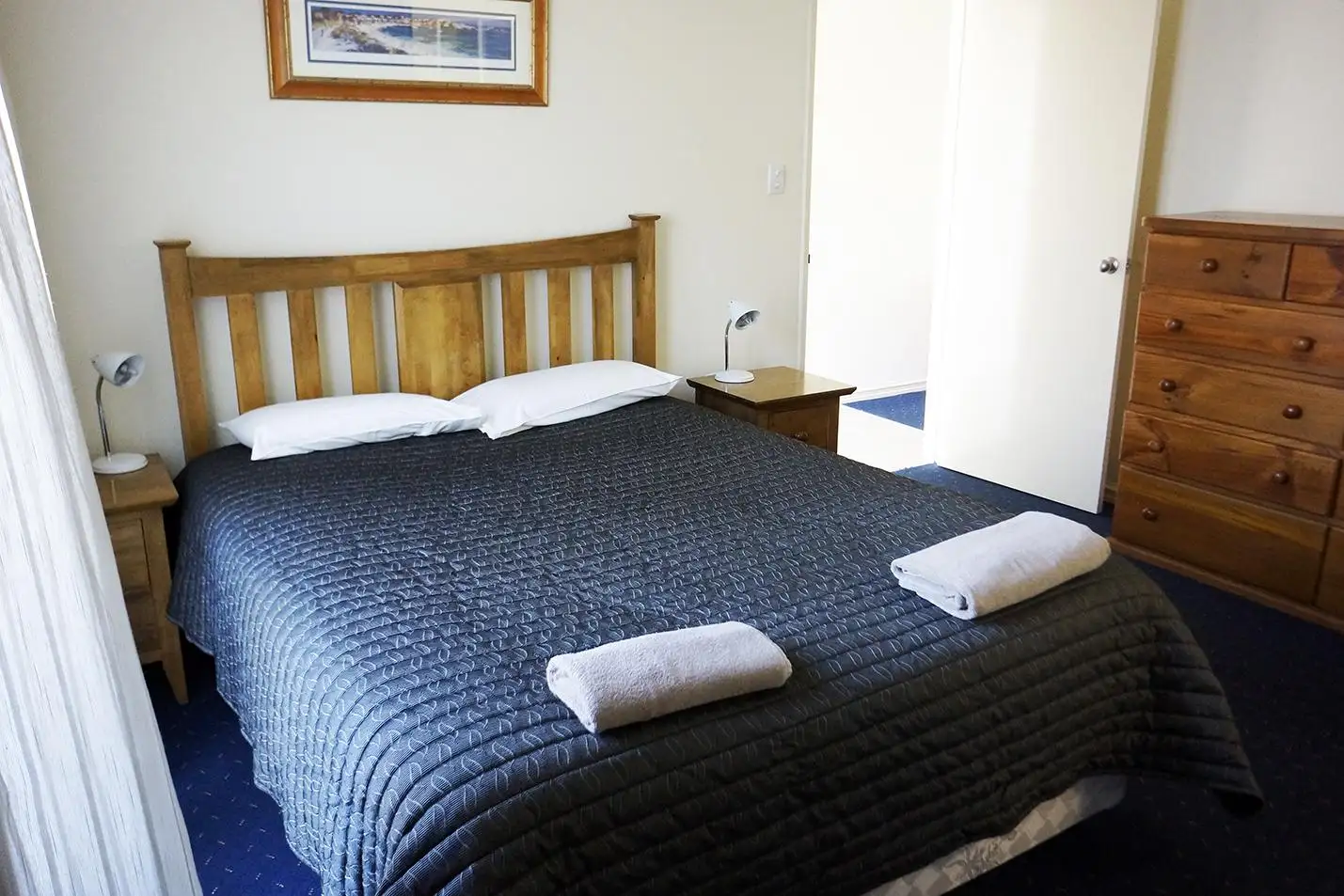 Bedroom is furnished with queen bed, wardrobe and chest of drawers.