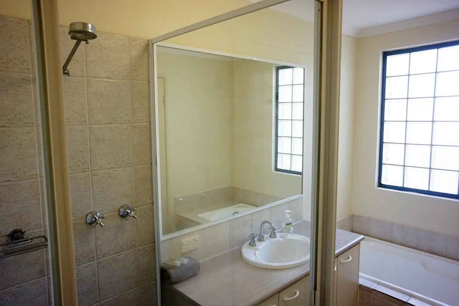Adjoining bathroom with bath, shower and handbasin. 55 and 49 do not have a bath.