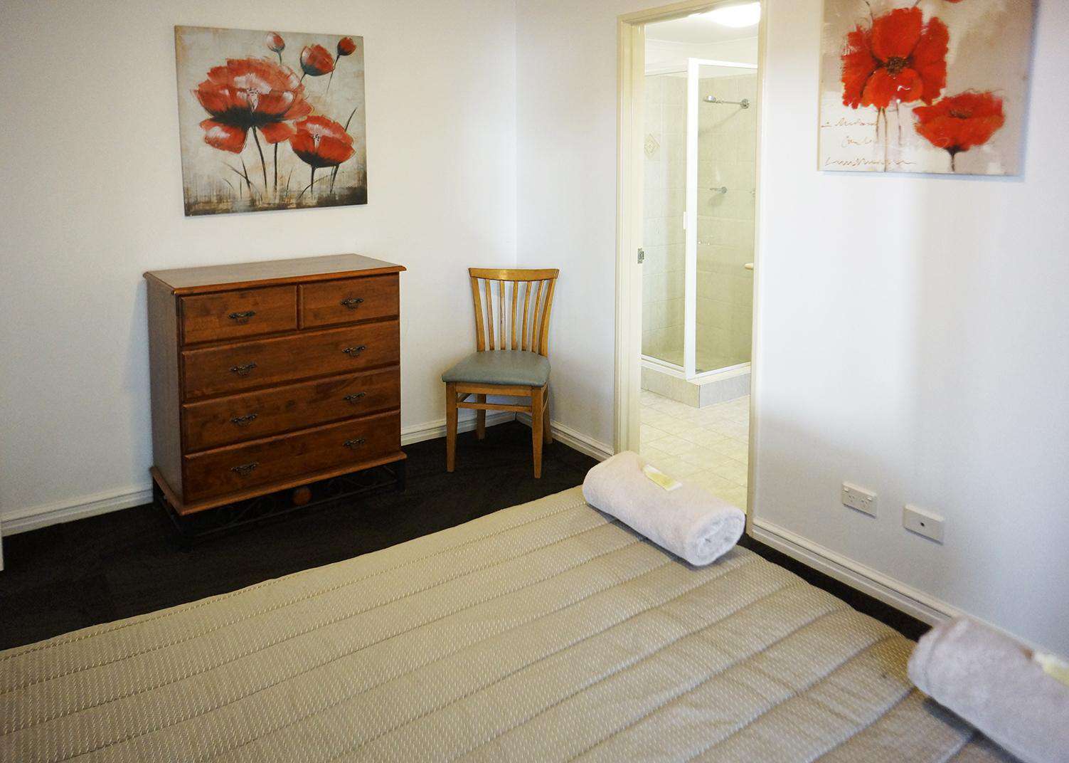 Bedroom is furnished with queen bed, wardrobe and chest of drawers.